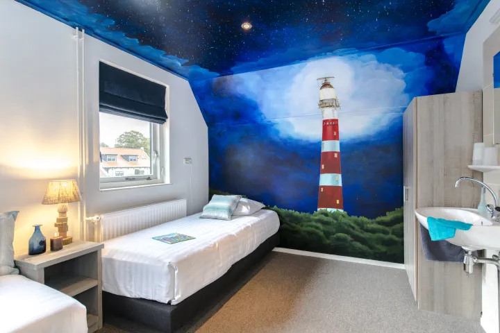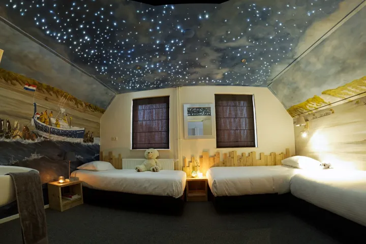 In dit vakantiehuis is gedacht aan alle luxe en comfort voor zowel de grote als de kleine gasten. Naast kindermeubilair, kinderkeuken en speelgoed is er boven een wel heel bijzondere slaapkamer! Een echte strandkamer met rood-witte vuurtoren, konijntjes, meeuwen en een heuse schatkist. Hier voel je je liggend in je witte strandhuis als op het strand!